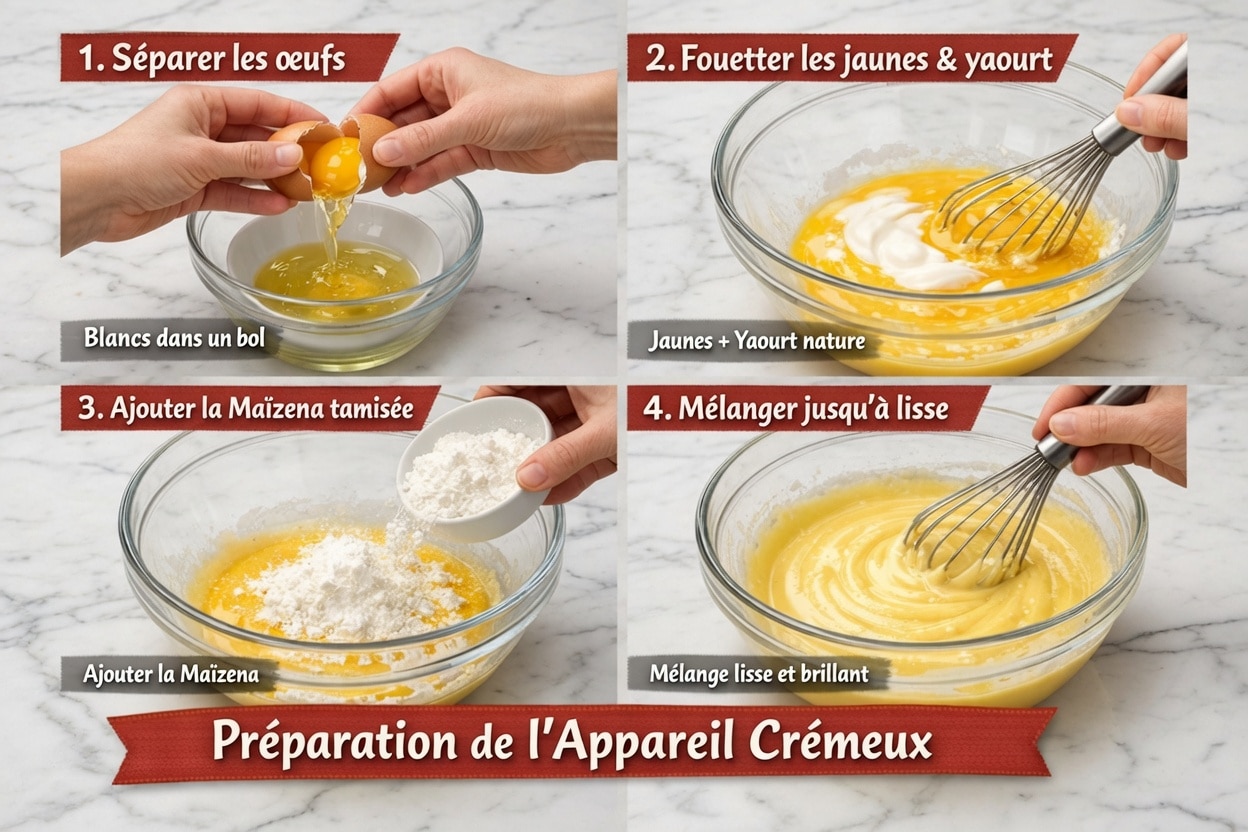 Dans un grand saladier, fouettez les jaunes avec le yaourt nature jusqu’à obtenir un mélange homogène. Ajoutez la maïzena préalablement tamisée. Mélangez vigoureusement au fouet (ou avec le fouet plat de votre robot pâtissier pour un résultat ultra-lisse en quelques secondes). L’appareil doit être brillant, soyeux et totalement sans grumeaux. Cette base lisse est essentielle pour que votre Gâteau Nuage au Yaourt reste uniforme après cuisson.